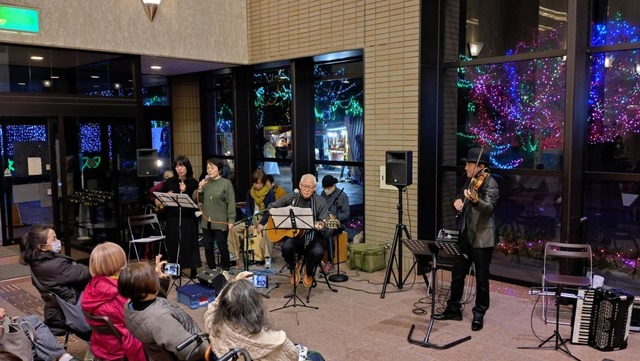 「みわ文化の杜・イルミネーション」を背景に我がダンディーズがボサノバ演奏