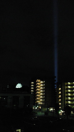 左が名古屋城、見難いけど右側に天空までとどく光が見えます。