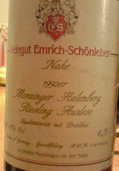 2000年にドイツ訪問した時に戴いた特別なワイン「エムリッヒ・シェンレバー家」の「モンツィガー・ハーレンゲルク1992アウスレーゼ」です。