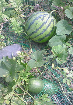 8月最後の日曜日の今朝、2苗で12個できた最後のスイカの収穫しようかと畑に行ったら、スイカで隠れていたカリモリの姿にびっくり。升目3cmくらいのネットに何故首を突っ込んだのか、苦しそうなカリモリちゃん。そのままこんなに大きくなっちゃったんだね(^_^;)半分に切らないと開放できないなあと思いながら切ることもままならず。やっぱり明日は包丁持って開放するから、待っててね。 ≪ 前の記事へ 一覧 次の記事へ ≫