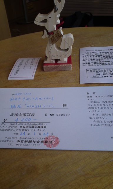本日、今月ライブの義援金を中日新聞社会福祉事業団へ寄託の際、かわいらしい竜の木工品を頂きました。義援金は9回目ですがこんなの初めて。そして明日の朝刊に即行で掲載されるらしいです。最近は義援金寄託者も激減の様子。橘屋はライブ出演者、参加者皆さんのお陰でこれからも継続するぞー! ≪ 前の記事へ 一覧 次の記事へ ≫