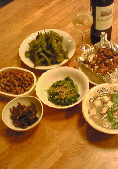 当然我が畑の旬の枝豆があり、間引きしたカブの摘み菜のお浸し(絶品でした)砂肝の塩焼き、肉団子と春雨のスープ、友人の畑で採れた落花生、自家製きゅうりの九ちゃん、以上で奥さんは手抜きで恥ずかしいから載せないでと言いましたがやってしまいました。