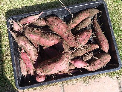 画像は紅あずま2本と鳴門金時1本を掘った収穫です。