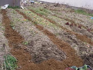 今日の作業はまず牛糞を畝の間に撒き、土を被せたその上に更に苦土石灰を撒いて、土壌をアルカリ性にして耕す前準備。
