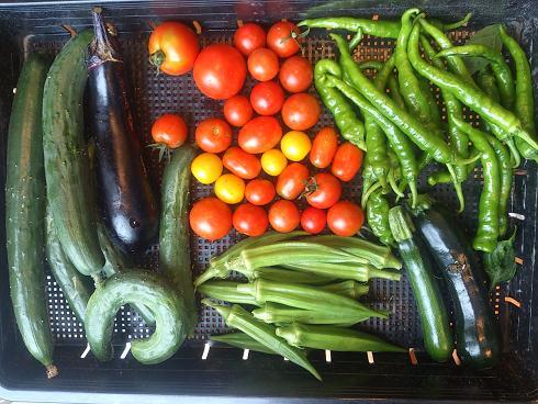 今日の収穫は、成長著しいオクラ、甘長ピーマン、茄子、胡瓜、ズッキーニとカラフルなトマト達でした。