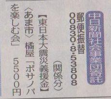 先週末のボサノバ好きの集い「裏ボサ」メンバーから参加費の一部を義援金にとの申し出があり本日、中日新聞社会福祉事業団へ寄託して参りました。「時が経つにつれ、薄れる傾向にあり継続してもらえることがありがたい」と、感謝してくださいました。金額は少ないけど、これからも続けたいと思います。9月5日中日新聞尾張版に掲載されました。メンバーの皆さん、ありがとうございました。 ≪ 前の記事へ 一覧 次の記事へ ≫