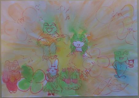 先日、3月に開催した東日本大震災被災者応援ボサノバ・ライブに参加された女性が、その時の雰囲気を水彩画で描いてみたので、と作品を持って来て頂きました。彼女が見た、ボサノバ・ライブのイメージは暖かく、優しい雰囲気に映ったようです。店長がカエルというのは愉しいですね。このようにボサファンが一人でも増えてくれるのは、とてもうれしいことです。考えてみれば、BGM以外ラジオ番組で特集でもなければ殆んど聴けませんものね。Iさん、ありがとうございました。 ≪ 前の記事へ 一覧 次の記事へ ≫