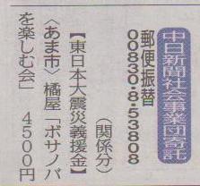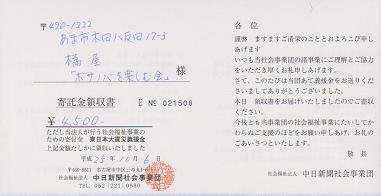 参加メンバーの賛同を得て、今回も中日新聞社会福祉事業団へ寄託させて頂きました。2011.3月よりの累計約160,000円以上になると思います。10月8日中日新聞朝刊、尾張版に掲載 ≪ 前の記事へ 一覧 次の記事へ ≫