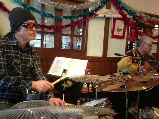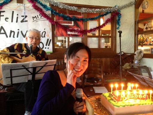 本日あまカフェライブ時に2つの誕生日祝いをしました。マダ・エ・マダムスのMISONOさんのお祝いをサプライズで計画していたところ、お客様の中で本日お誕生日という女性がおられ、急遽彼女にもブラジル風お誕生祝をサプライズでプレゼントし、とても喜んで頂きました。お誕生日のvocal・MISONOさんには彼女が唄う2曲目に突然バースデーソングとスペシャルケーキ。あまカフェスタッフが作ってくれたブラジル流ケーキにはブラジル国旗とギターのデコレーションと、壁にはFeliz・Aniversario(お誕生日おめでとう)の掛け軸まで!!あまカフェ・スタッフの皆さん、ありがとうございました。突然のサプライズにゲストのデュオ・SORAのマーシャスと凛さんも加わって大いに盛り上がったLive&HappyBirthdayでした。平均年齢を上げる2人Dandy・Suzuki&Gaga ≪ 前の記事へ 一覧 次の記事へ ≫
