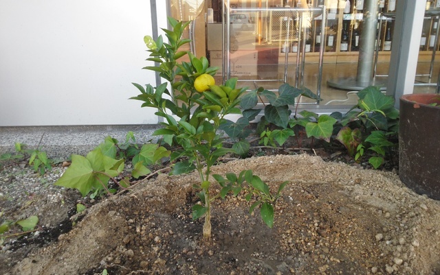 今日店頭のジュンベリーの樹の間に、孫の名前由来の柚を植樹。