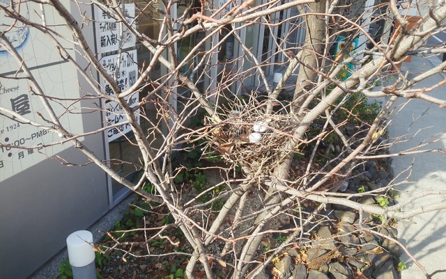 何ということでしょう!店前で一服していて、ふとJuneberryの樹に眼をやると何か鳥の巣らしきものが在るではありませんか。しかも中には卵が二つ。子育てしている最中にすっかり落葉して樹は丸裸。人通りのあるこの場所での子育ては、とても無理だと諦めたのかもしれませんね。多分玄関前にあるシマトネリコの樹にいつも巣を作る土鳩だと思いますが、こんなこともあるんですね!? ≪ 前の記事へ 一覧 次の記事へ ≫